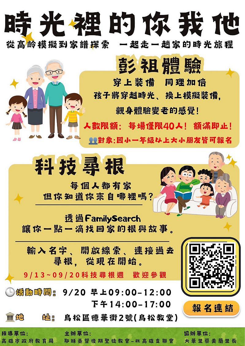 《2025時光裡的你我他—彭祖體驗與科技尋根闖關》 於高雄鳥松教堂圓滿落幕 連結世代情感 探索家的故事 2025/09/21 - 王培興報導 - 【記者王培興/高雄報導】為推廣尊老愛家與家族文化傳承,由高雄市政府教育局指導、耶穌基督後期聖徒教會高雄鳥松教堂主辦、大華里里長協辦的《2025時光裡的你我他》活...