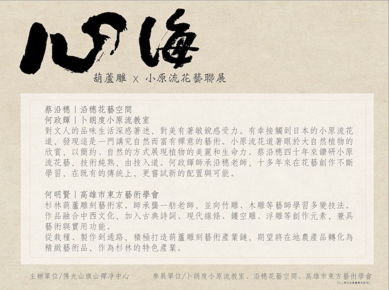 此次展覽由佛光山旗山禪淨中心邀請深耕葫蘆雕刻與產業多年的藝術家何明賢,鑽研小原流花藝四十載的蔡沿穗老師,以及師承沿穗老師的卜朗度小原流教室何政輝,於旗山武德殿以「心海」為主題,進行葫蘆雕與花藝的聯合展出。