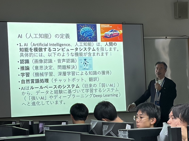 林文傑教授以「AI 的定義」為起點,從認識、推論、學習到自然語言處理四大核心功能出發,講解人工智慧如何透過大量資料與模型進行判斷。他同時以自駕車、搜尋引擎、語音助理等案例,說明 AI 如何深刻改變日常生活。以清楚的日文圖像與生活例子帶領學生理解複雜概念,讓姬路高校學生在短時間內掌握 AI 技術的基本架構。