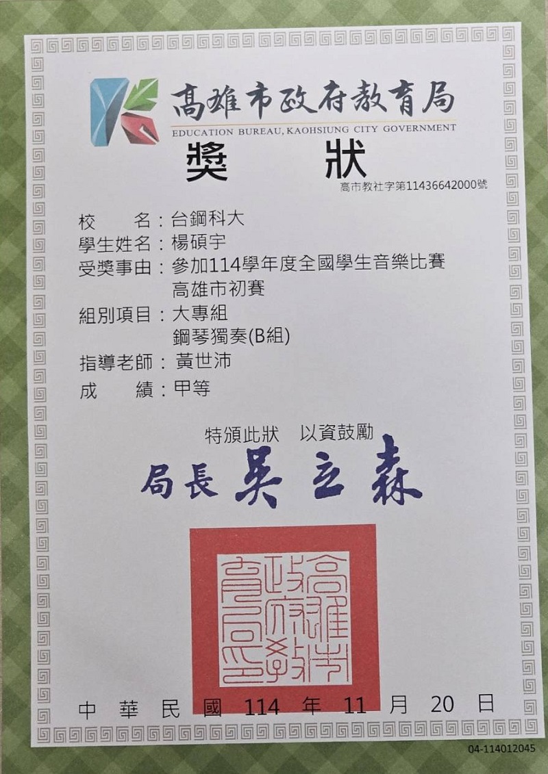 【記者鄭慧美/高雄報導】休閒運動管理系三年級學生楊碩宇同學,日前參加「114學年度全國學生音樂比賽」,憑藉卓越的鋼琴琴藝與沉穩的舞台表現,在大專組鋼琴獨奏項目中脫穎而出,榮獲甲等佳績,並成功代表高雄市取得進軍全國學生音樂決賽的資格。