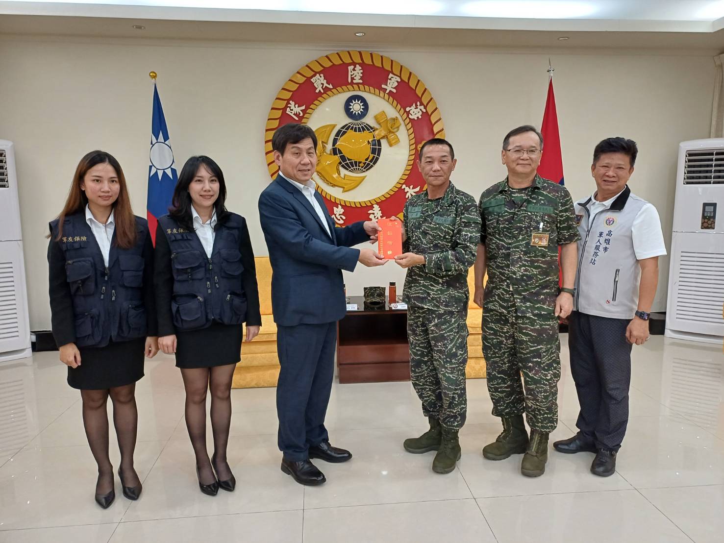 【記者鄭慧美/高雄報導】軍友保險代理人股份有限公司為感念國軍官兵在保國衛民上的辛勞與付出,今(23)日上午由董事長郭建忠率領總經理黃秀芬、總顧問歐復興,以及國軍急難慰助慈善協會理事長黃開森等人,在高雄市軍人服務站站長吳俊一及幹事陳柏夆陪同下,前往陸軍第八軍團指揮部、空軍航空技術學院、海軍艦隊指揮部、海軍陸戰隊指揮部及新兵訓練中心實施敬軍慰勞,代表事業體向全體官兵致敬,並提前祝賀中秋佳節快樂。