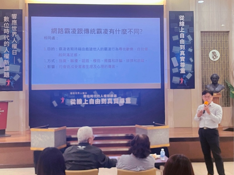 人權講座以「數位時代的人權新課題-從線上自由到真實尊重」為主題,邀請中華國際人權促進會執行長李惠芬分享。她強調人權的核心價值在虛擬與現實世界皆應一致,並指出「責任」是落實聯合國 30 條人權的軸心。此外,現場亦邀請崇仁醫護管理專科學校 兼任教師蕭育昇分享,他說明網路霸凌不易擺脫,並提醒在數位時代,大人對霸凌與兒少性詐騙的覺察與關心至關重要。