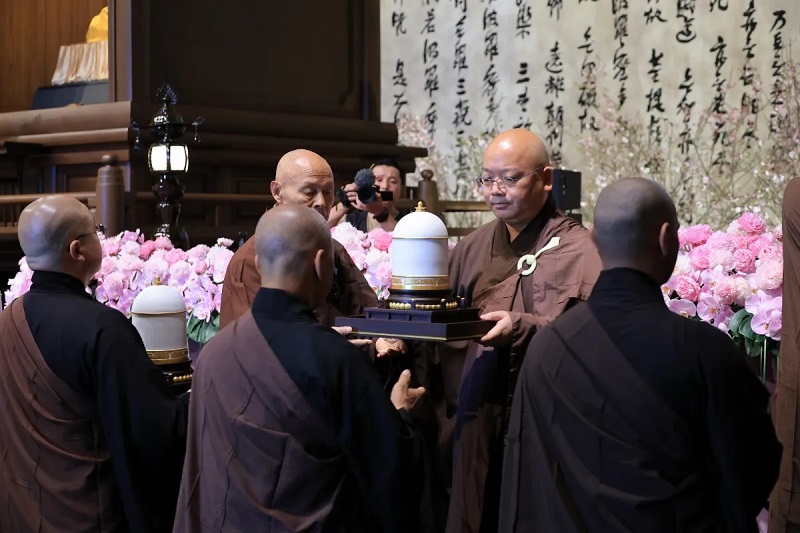 佛光祖庭大覺寺(暫奉佛光山)、美國西來寺、巴西如來寺、歐洲法華禪寺、馬來西亞東禪寺、日本法水寺、泰國泰華寺、菲律賓萬年寺、印度德里文教中心、韓國首爾佛光山寺、非洲南華寺及大洋洲南天寺等12處道場代表,在大師聖像前頂禮三拜,依序從心保和尚手中恭敬承接大師靈骨;信眾見證歷史一刻,感動紅了眼眶,這不只是大師慈悲與智慧的精神延續,亦象徵人間佛教弘揚五大洲,持續照亮人心、光照寰宇。