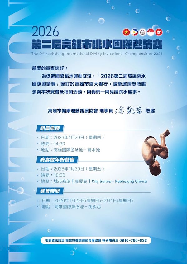 促進國際跳水交流 2026第二屆高雄跳水國際邀請賽1/29盛大登場 2026/01/21 - 鄭慧美報導 - 【記者鄭慧美/高雄報導】為持續推動跳水運動國際化發展,並深化台灣與國際體育界的交流合作,「2026第二屆高雄跳水國際邀請賽」將於1月29日於高雄市隆重登場。本屆...