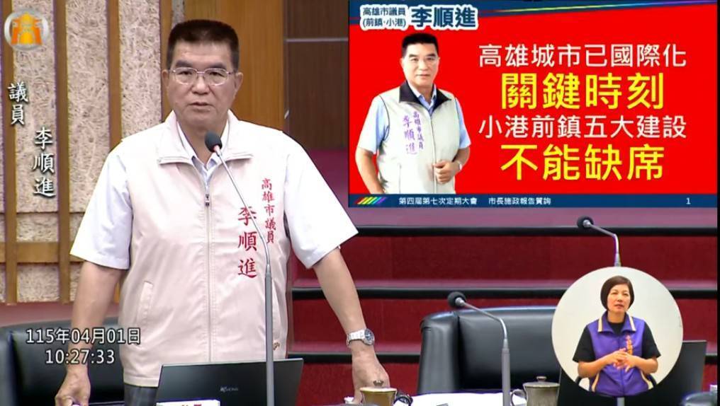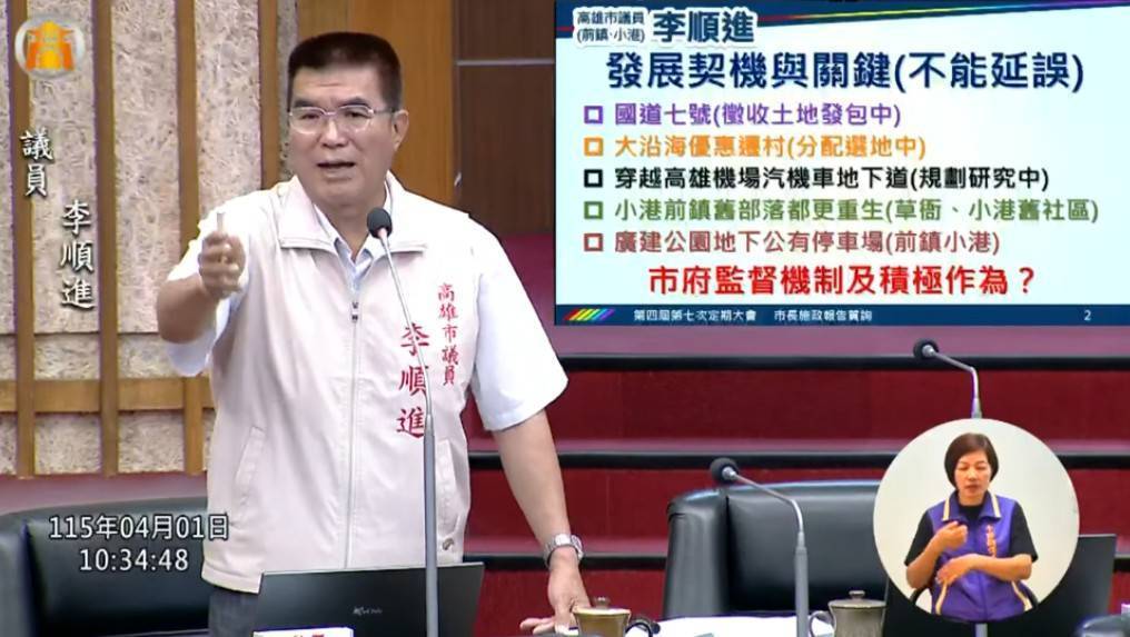 高雄市議員李順進4月1日在議會質詢時強調,前鎮、小港是高雄產業與對外門戶重鎮,市府在推動城市轉型的同時,不能讓南高雄被邊緣化,重大建設必須加速推動、基礎建設必須到位,地方產業更需要實質支持。
