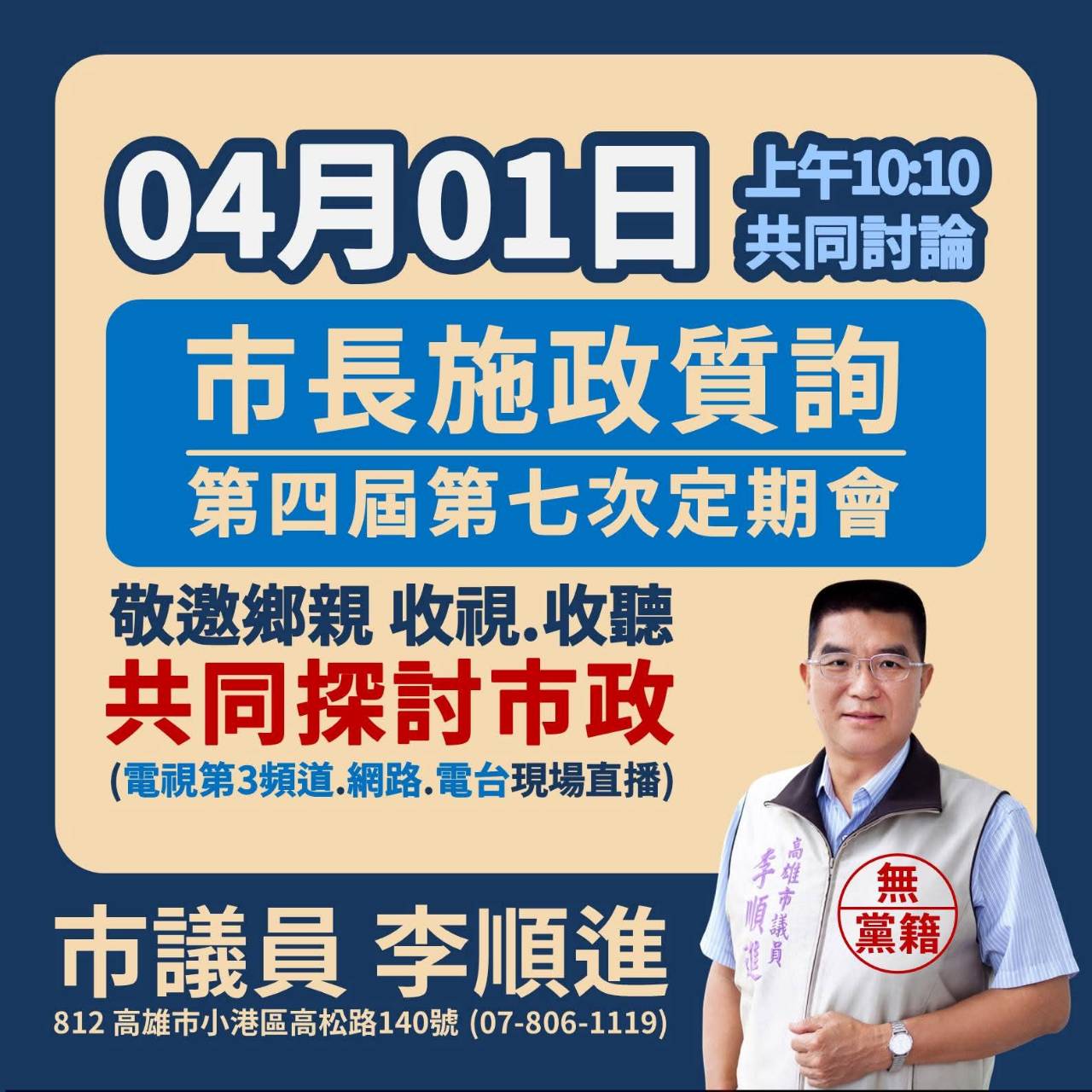 李順進也在質詢中提到,前鎮、小港聚集大量基層產業,從農產加工、木材加工到各類製造業,許多工廠與勞工長期在第一線打拚,支撐高雄經濟發展,但在城市轉型與產業升級的過程中,政府更應重視基層產業的生存與發展條件,包括交通運輸、產業用地、公共設施與整體產業環境改善,不能只談高科技與大建設,卻忽略基層產業的需求。