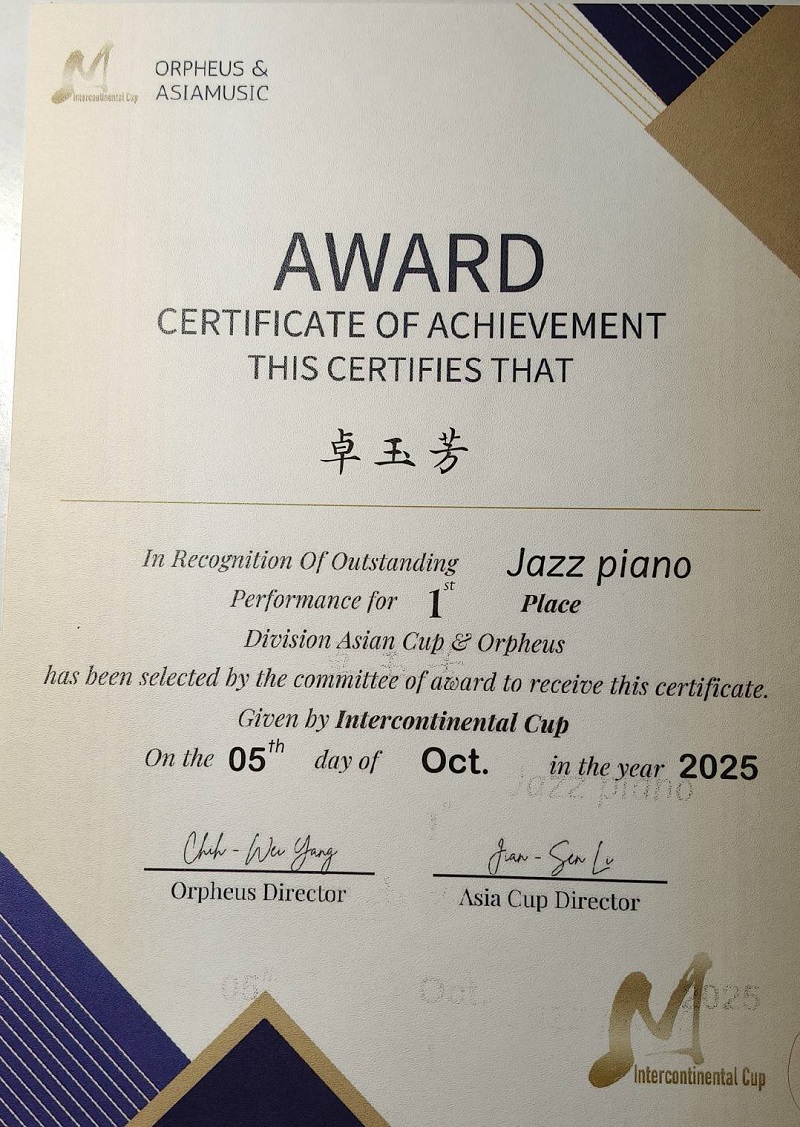 洲際盃音樂大賽秉持「倡導音樂教育,切磋音樂造詣,發掘音樂人才」的宗旨,致力於提供國內外音樂學習者專業的展演舞台。卓玉芳同學此次榮獲洲際盃冠軍,不僅彰顯個人在音樂領域的傑出天賦與長期努力,更是台鋼科大推動適性教育、鼓勵學生多元發展的具體展現。